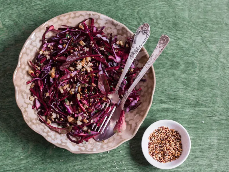 Preparate quindi l’emulsione per l’insalata con il succo della seconda arancia, 2 cucchiai d’olio, il sale e il pepe. Condite il cavolo con la salsa e sbriciolandovi sopra le noci.