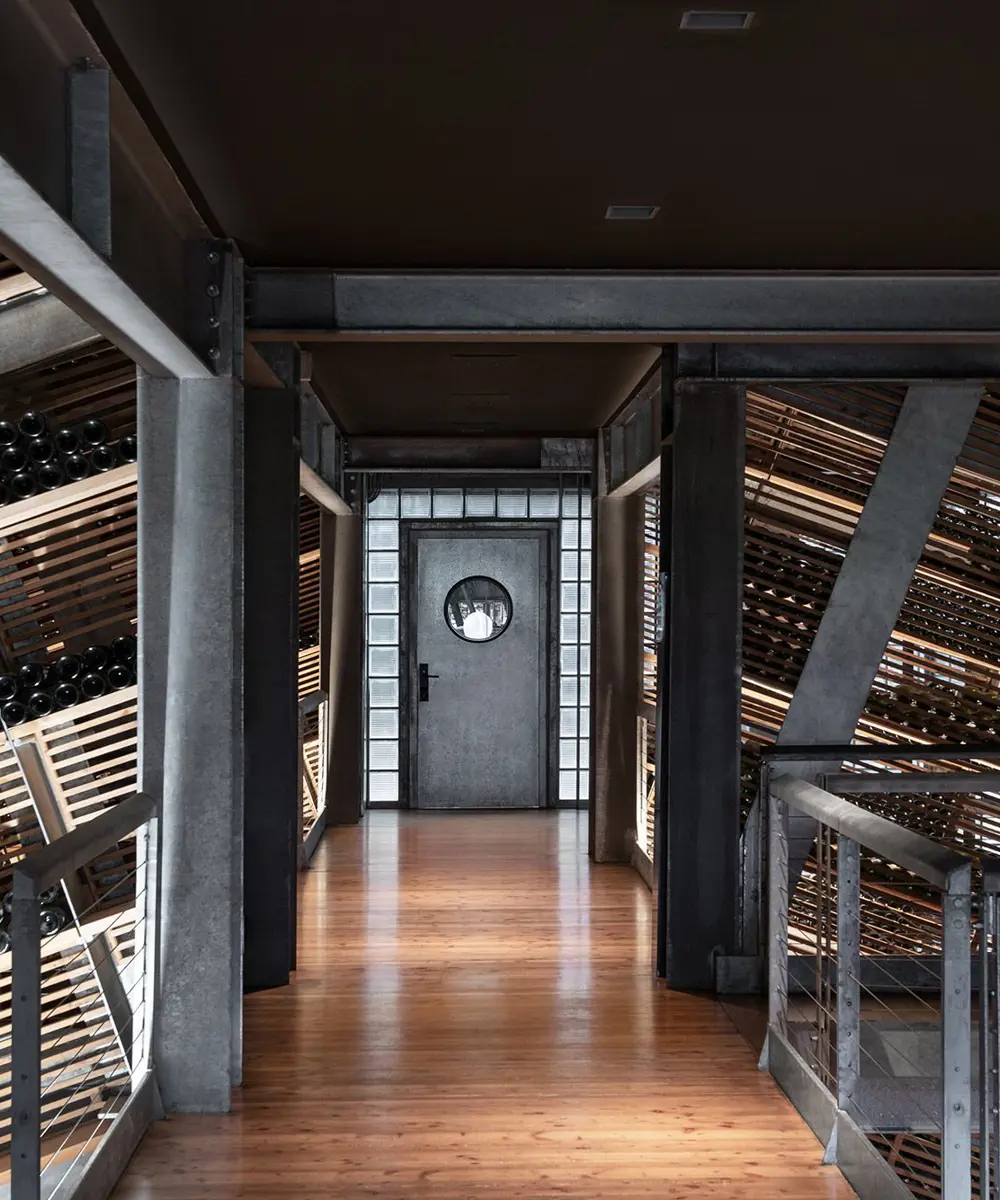 Botti, barriques, bottiglie e passerelle aeree disegnano gli spazi e racchiudono l'essenza di questa terra.