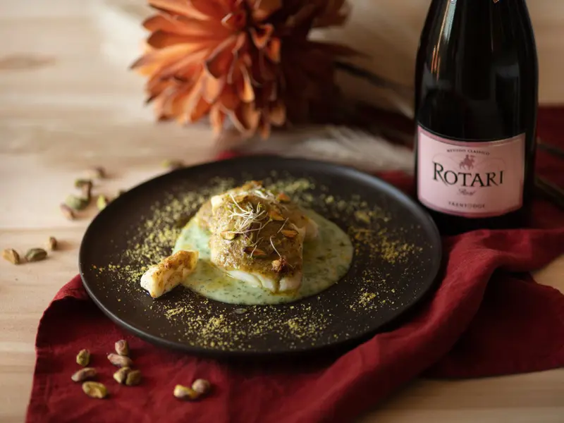 Scaldare la vichyssoise e stenderla in piatti piani e larghi, adagiarvi sopra un filetto di pesce con la crosta, guarnire con qualche foglia di prezzemolo fresco e servire insieme a un calice di Rotari Rosé: non potete sbagliare!