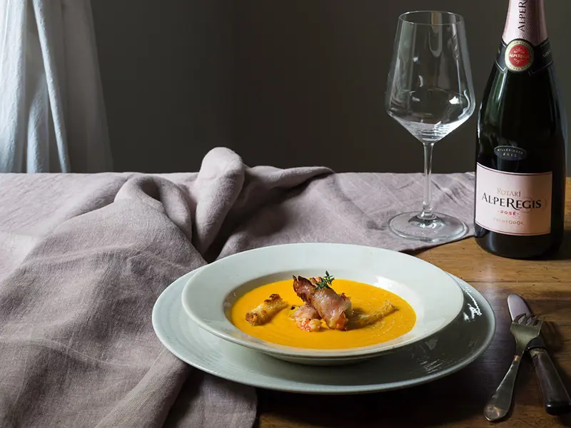Una bottiglia di Rotari AlpeRegis Rosé e una vellutata di carote con gamberi e gola è tutto quello che serve per una cena perfetta! Sonia Paladini ci spiega la sua ricetta realizzata per Rotari.