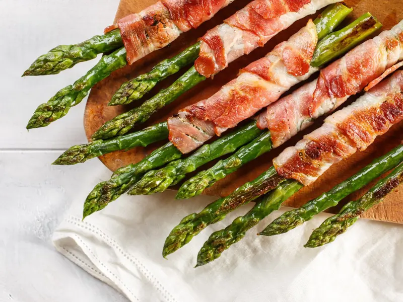 Preparate ora le fette di pancetta: stendetele sovrapponendole a due a due su di un piano, ed adagiatevi sopra uno o più asparagi. Aggiungete qualche pezzetto di scamorza e avvolgetevi infine intorno la pancetta. Cuocete gli involtini in una padella antiaderente con un filo d’olio, per circa 5 minuti per lato. Quando la pancetta risulterà ben cotta e croccante, toglieteli dalla padella e asciugateli su di un piatto con carta assorbente da cucina.
